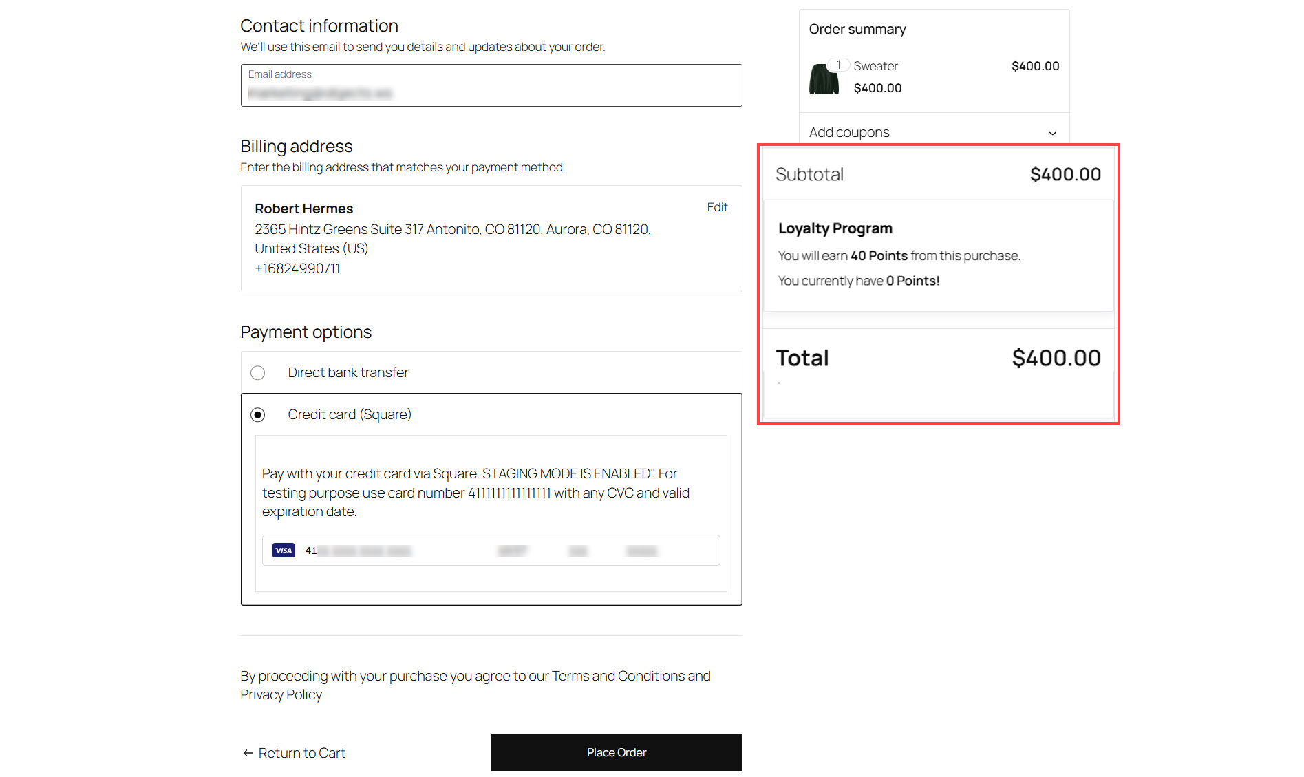 Test the payment gateway with new Square API integrated, which enables to send test transactions from Sandbox Mode and reflect them in the Square Sandbox Account with all the details of the transactions.